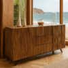 Madera clara con acabado natural, diseño orgánico y líneas suaves.