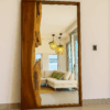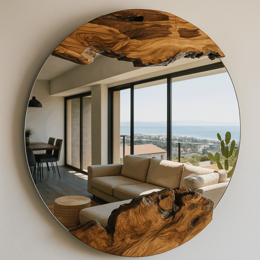 Espejo redondo decorativo con incrustaciones orgánicas de madera natural tallada a mano, que contrastan con la superficie pulida del cristal. El diseño celebra la imperfección y la belleza cruda de la naturaleza, ideal para espacios costeros, wabi-sabi o interiores contemporáneos. Se fabrica con maderas seleccionadas como parota