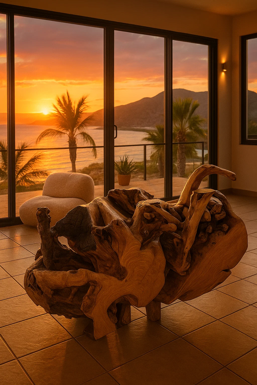 Desde este entorno privilegiado concebimos cada creación: muebles de parota y raíces que conservan la fuerza y textura del material, transformados en piezas que llevan consigo la serenidad y el espíritu de Baja California Sur.