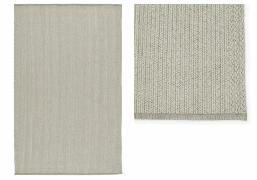 Un tapete en color beige suave con un diseño de trenza en relieve que le da una textura muy interesante. Su tono neutro y cálido es perfecto para crear un ambiente de calma y tranquilidad. Medidas: 1.82 m x 2.74 m y 2.69 m x 3.58 m.