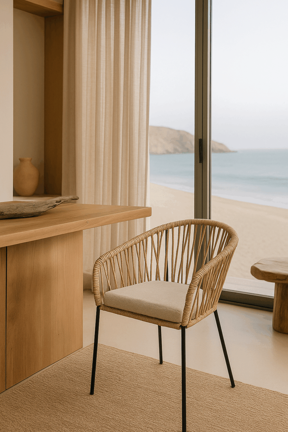 Estructura metálica ligera con acabado negro mate, combinada con un respaldo tejido en fibra sintética de apariencia natural.