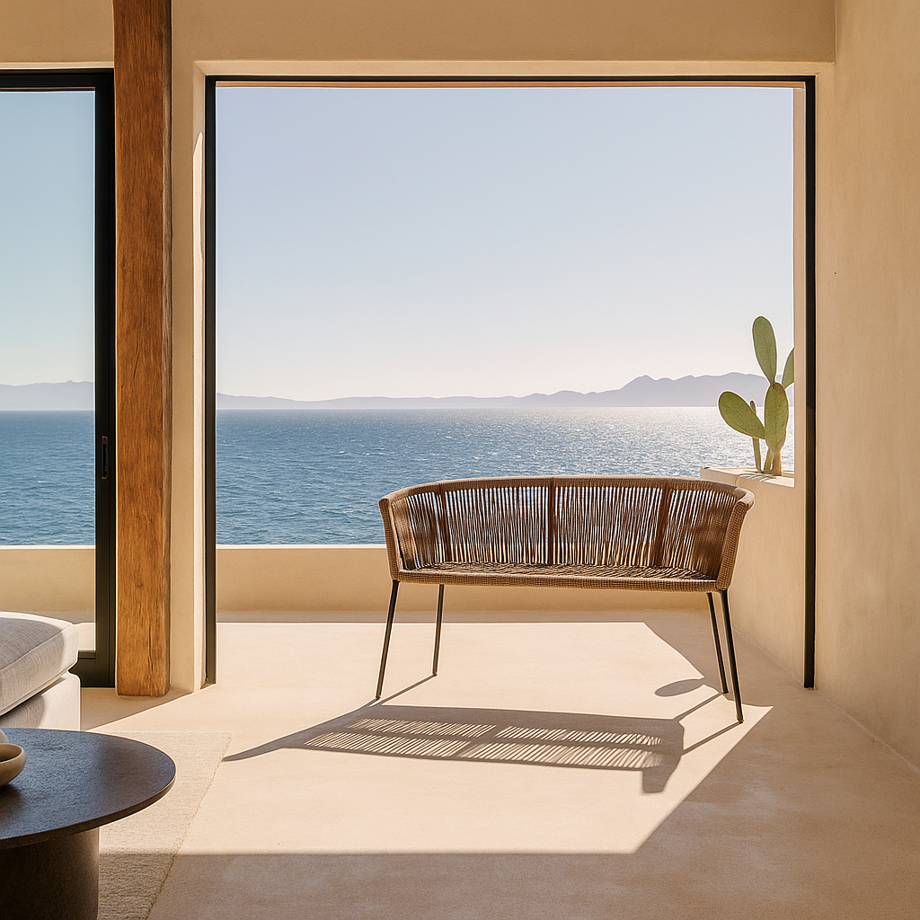 El asiento redondo y los cojines en tela neutra crean una experiencia de descanso cómoda y visualmente equilibrada.