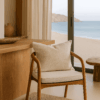 Estructura de madera maciza con brazos redondeados y tapizado en tela neutra de textura cálida.